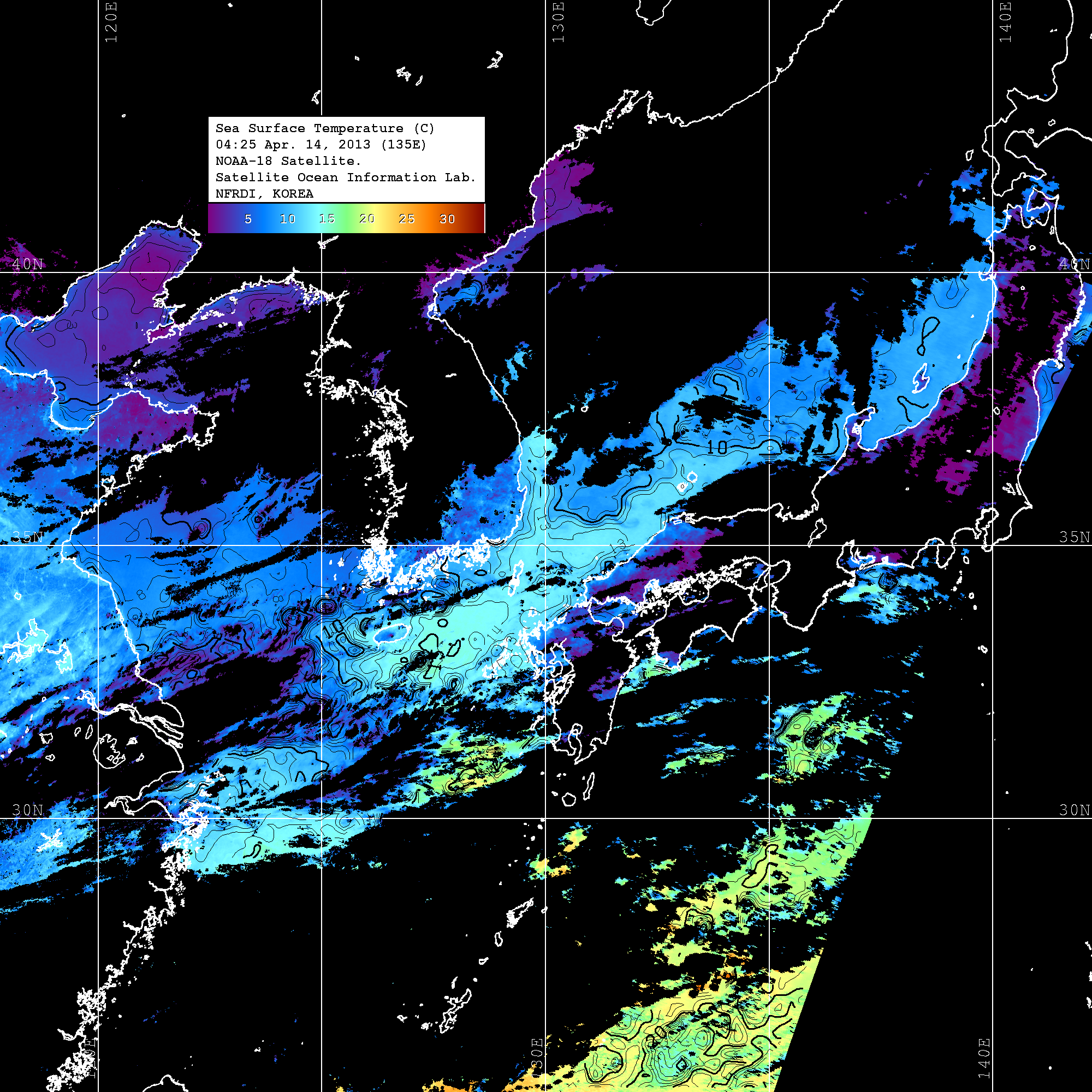 o 2013년 04월 14일 NOAA 위성영상입니다. o 영상 시간 및 수온분포는 범례를 참고하시기 바랍니다. o 검은색은 구름을 나타냅니다. o 그림을 클릭하시면 크게 보실 수 있습니다.