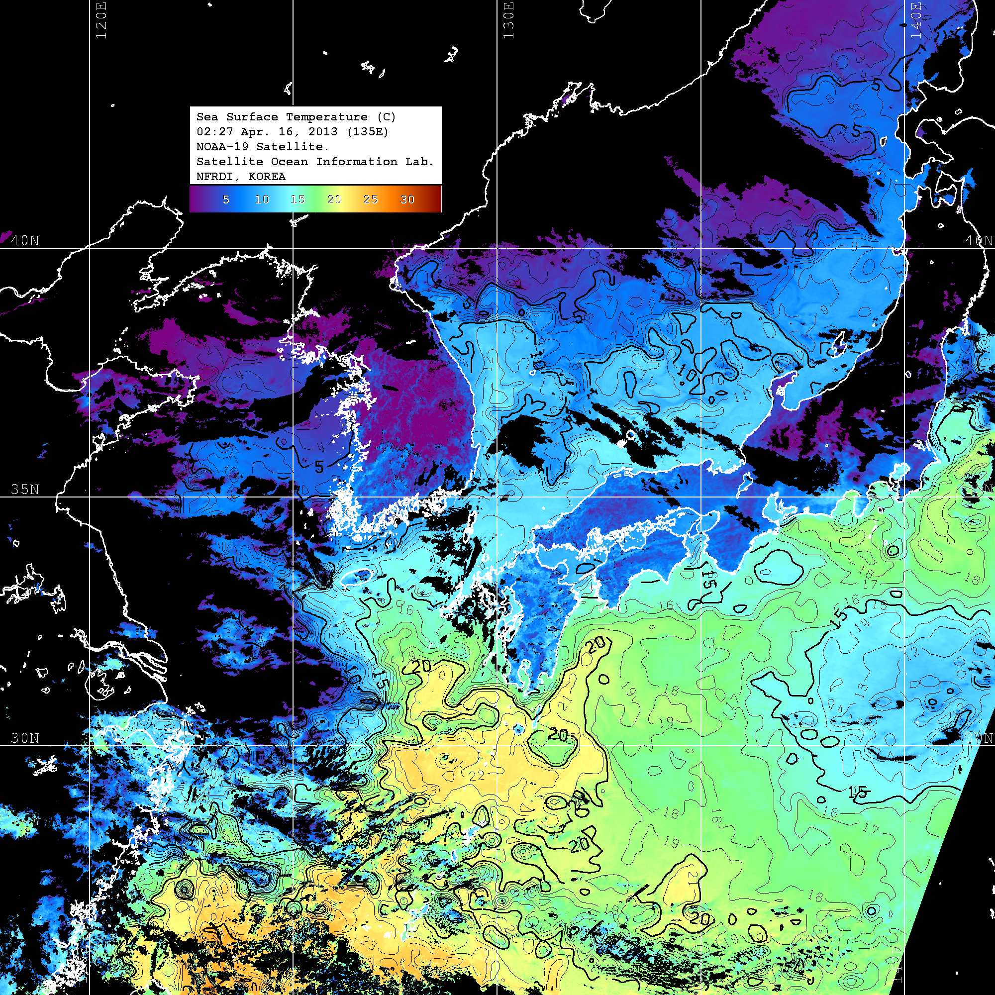 o 2013년 04월 16일 NOAA 위성영상입니다. o 영상 시간 및 수온분포는 범례를 참고하시기 바랍니다. o 검은색은 구름을 나타냅니다. o 그림을 클릭하시면 크게 보실 수 있습니다.