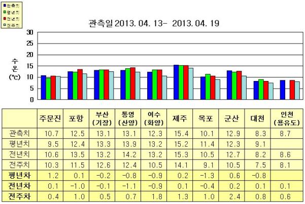 ◦ 금주(2013. 04. 13~2013. 04. 19)의 한반도 연안 표면수온은 동해 연안역에서 섭씨 10.5~13.5도, 남해 연안역 12.0~15.5도, 서해 연안역에서 8~13도로 나타납니다. ◦ 평년에 비해 주문진 1.2도 높음을 제외한 동해 연안역은 비슷하게, 제주 비슷함을 제외한 남해 연안역은 0.5~1.0도 낮게, 군산 0.6도 높음을 제외한 서해 연안역은 0.5~1.5도 낮게 나타납니다. ◦ 전년에 비해 포항 1도 낮음을 제외한 동해 연안역은 비슷하게, 제주 비슷함을 제외한 남해 연안역은 0.5~1.5도 낮게, 목포 0.4도 낮음을 제외한 서해 연안역은 비슷하게 나타납니다. |