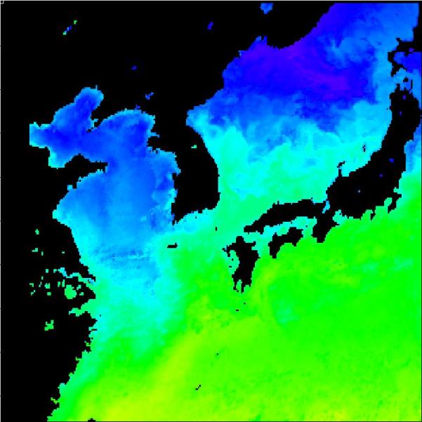국립수산과학원 위성해양정보실에서 연구중인 2013년 04월 25일 구름이 배제된 수온 영상입니다