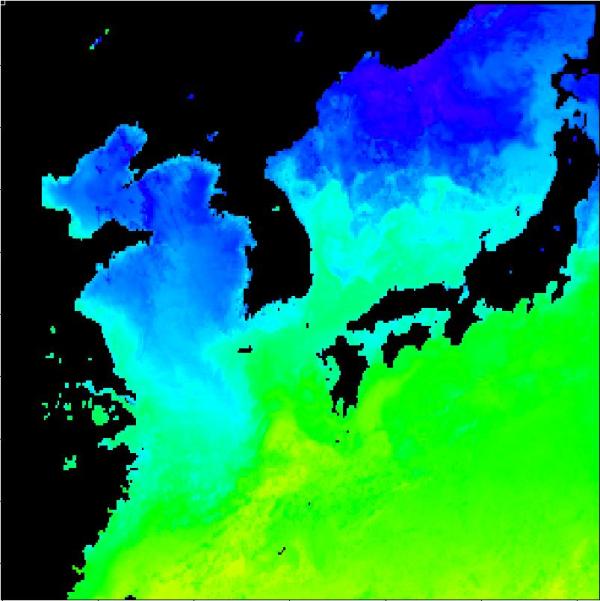 국립수산과학원 위성해양정보실에서 연구중인 2013년 04월 26일 구름이 배제된 수온 영상입니다