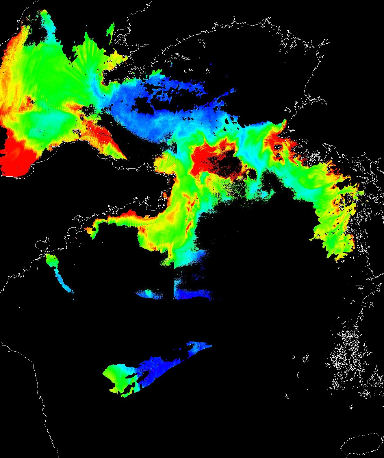 o 2013년 04월 30일 천리안 GOCI 위성영상입니다. [ GOCI : Geostationary Ocean Color Imager ] o 농도분포는 하단 범례를 참고하시기 바랍니다. o 검은색은 구름을 나타냅니다. o 그림을 클릭하시면 크게 보실 수 있습니다. o 천리안 GOCI 클로로필 a 동해지역. o 천리안 GOCI 클로로필 a 서해지역. o 천리안 GOCI 클로로필 a 남해지역. 천리안 GOCI 클로로필 a 둥중국해지역. o 천리안 GOCI 클로로필 a 대화퇴지역. ![]() 천리안 GOCI 영상은 한국해양과학기술원 해양위성센터에서 수신하였습니다. |