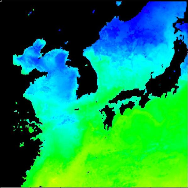 국립수산과학원 위성해양정보실에서 연구중인 2013년 05월 02일 구름이 배제된 수온 영상입니다