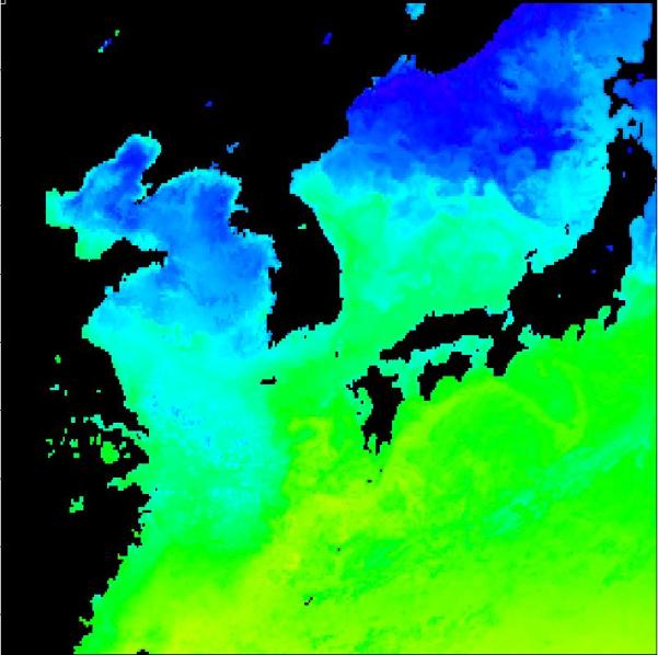국립수산과학원 위성해양정보실에서 연구중인 2013년 05월 04일 구름이 배제된 수온 영상입니다