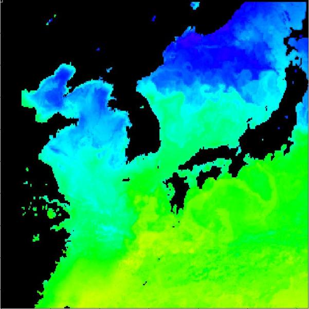국립수산과학원 위성해양정보실에서 연구중인 2013년 05월 05일 구름이 배제된 수온 영상입니다