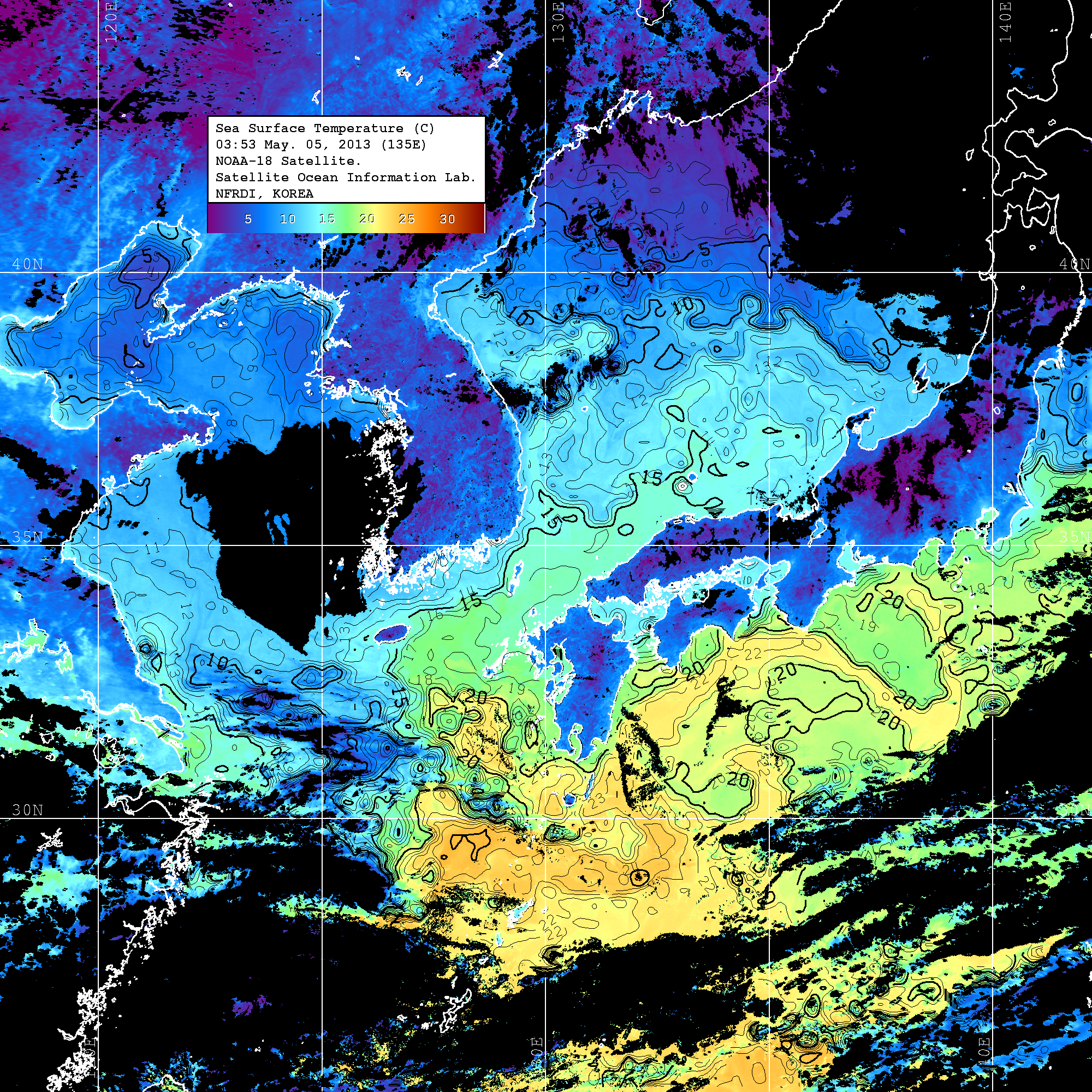 o 2013년 05월 05일 NOAA 위성영상입니다. o 영상 시간 및 수온분포는 범례를 참고하시기 바랍니다. o 검은색은 구름을 나타냅니다. o 그림을 클릭하시면 크게 보실 수 있습니다.