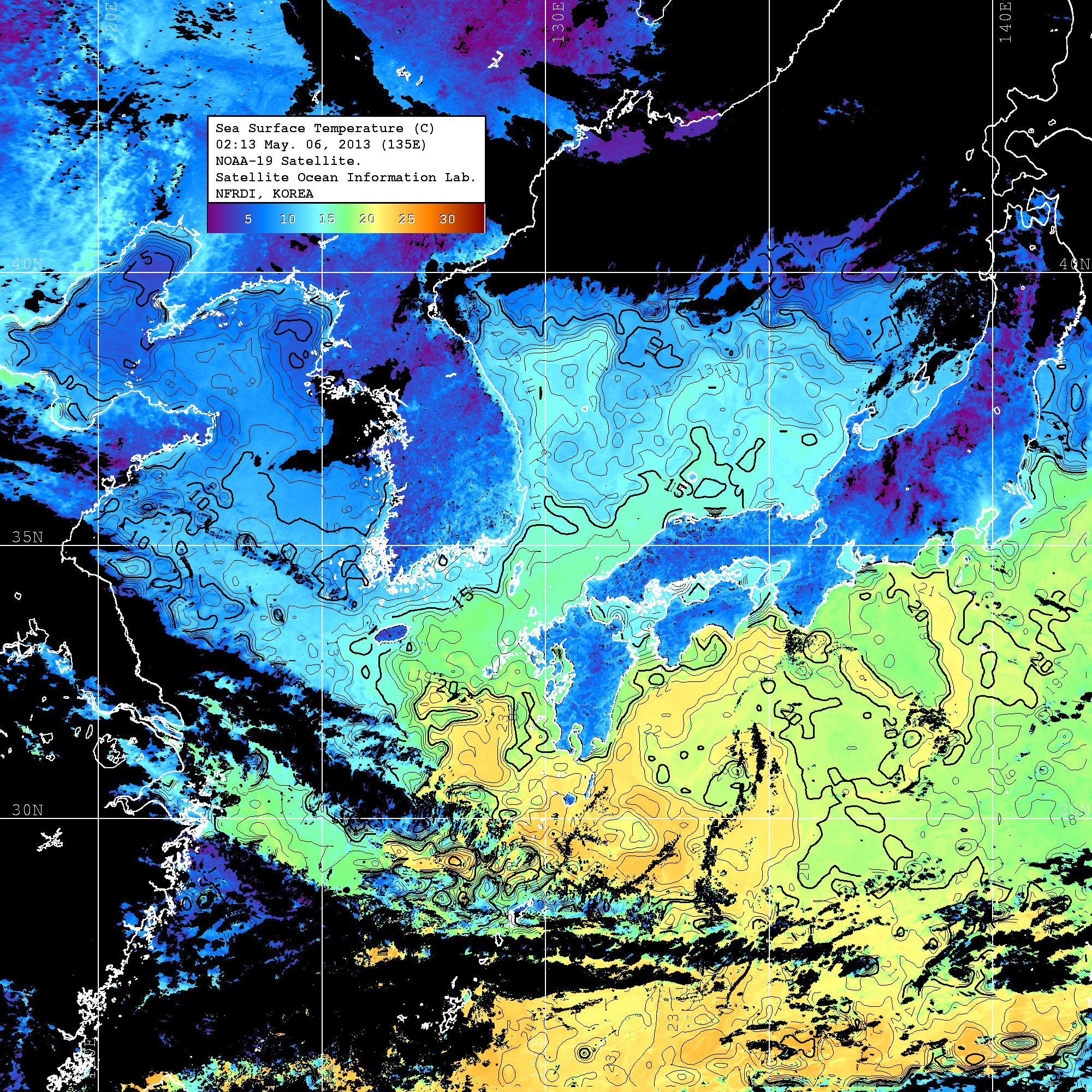 o 2013년 05월 06일 NOAA 위성영상입니다. o 영상 시간 및 수온분포는 범례를 참고하시기 바랍니다. o 검은색은 구름을 나타냅니다. o 그림을 클릭하시면 크게 보실 수 있습니다.