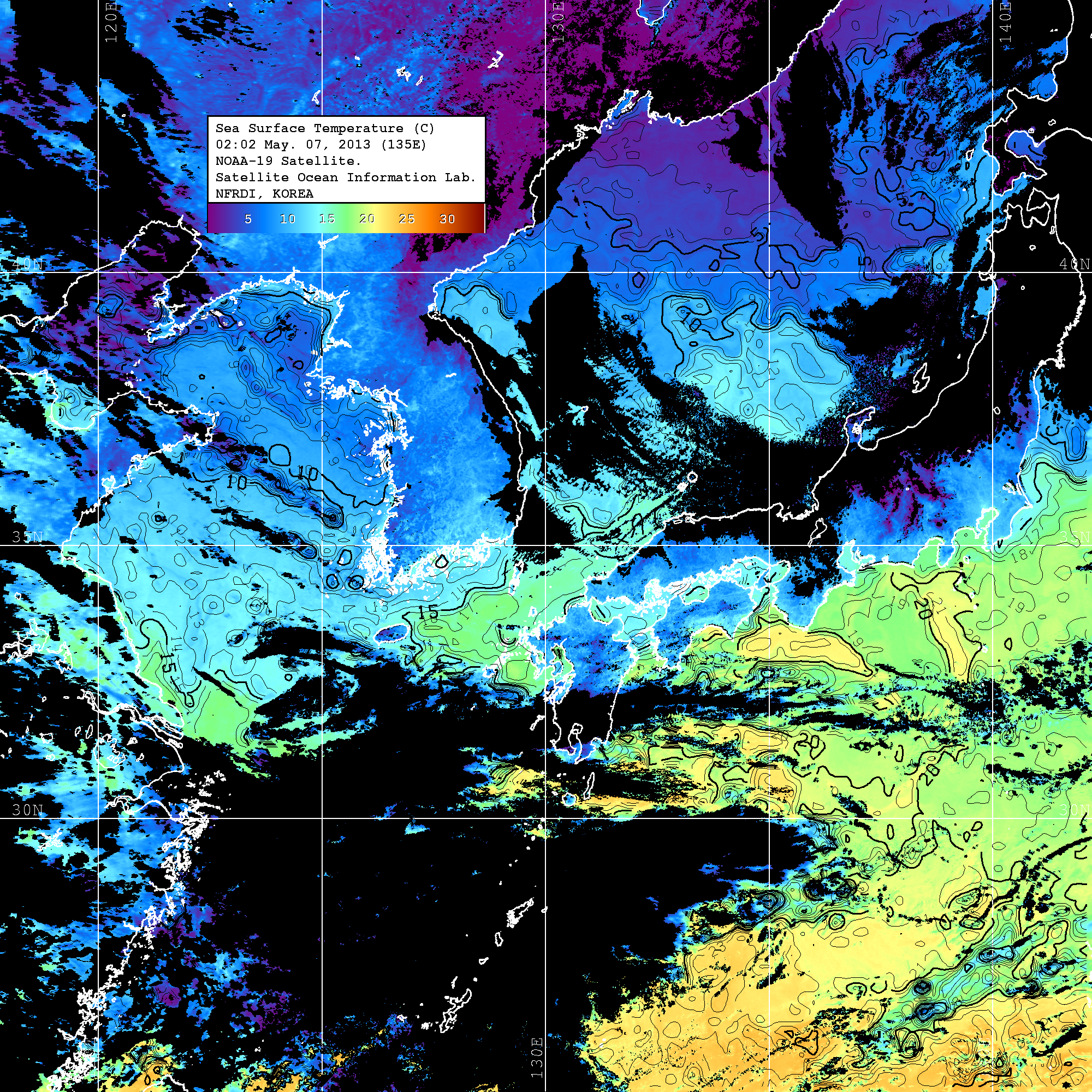 o 2013년 05월 07일 NOAA 위성영상입니다. o 영상 시간 및 수온분포는 범례를 참고하시기 바랍니다. o 검은색은 구름을 나타냅니다. o 그림을 클릭하시면 크게 보실 수 있습니다.