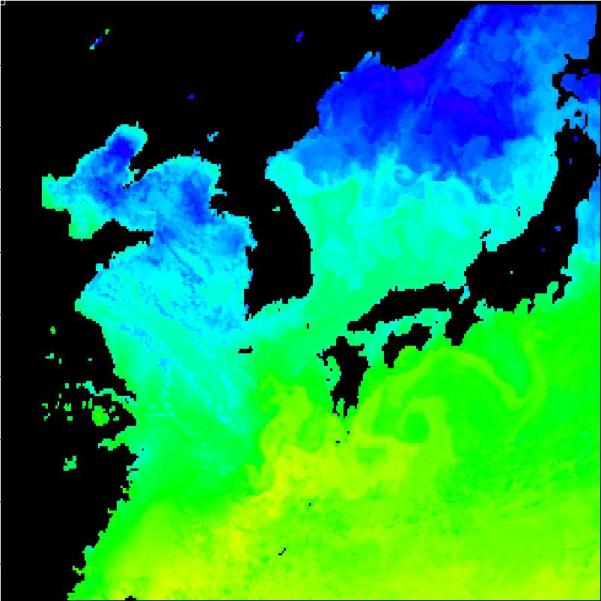 국립수산과학원 위성해양정보실에서 연구중인 2013년 05월 07일 구름이 배제된 수온 영상입니다