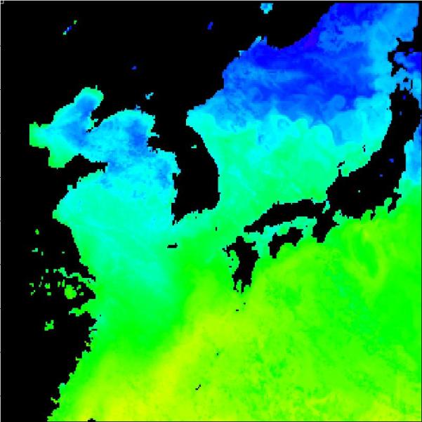 국립수산과학원 위성해양정보실에서 연구중인 2013년 05월 09일 구름이 배제된 수온 영상입니다