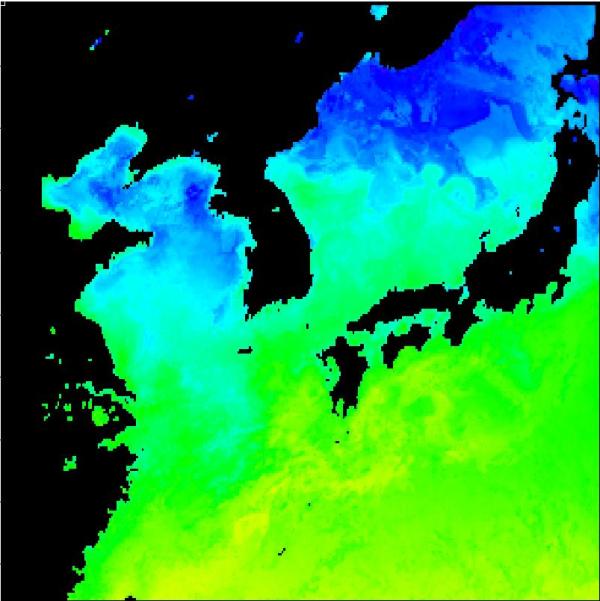 국립수산과학원 위성해양정보실에서 연구중인 2013년 05월 12일 구름이 배제된 수온 영상입니다