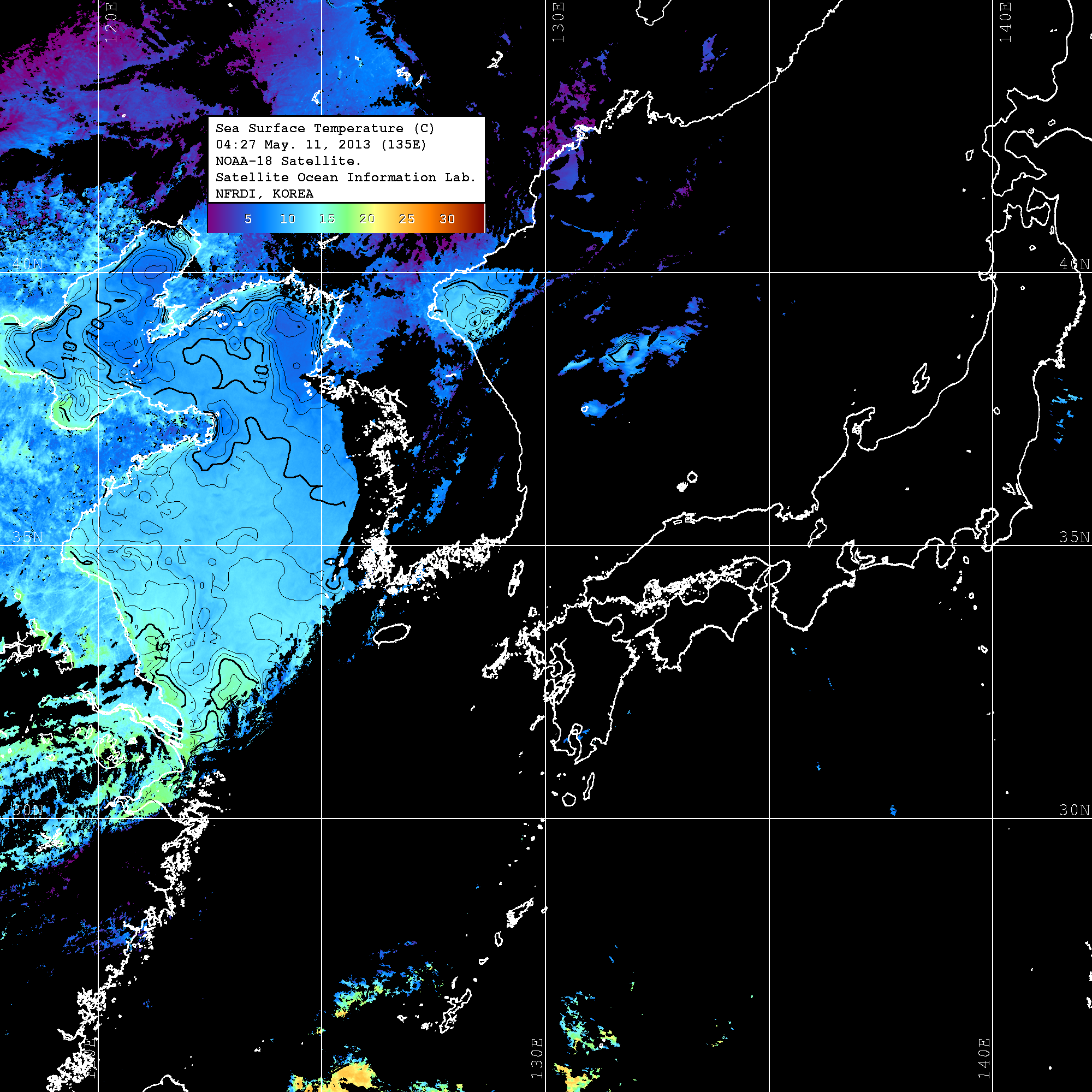 o 2013년 05월 11일 NOAA 위성영상입니다. o 영상 시간 및 수온분포는 범례를 참고하시기 바랍니다. o 검은색은 구름을 나타냅니다. o 그림을 클릭하시면 크게 보실 수 있습니다.
