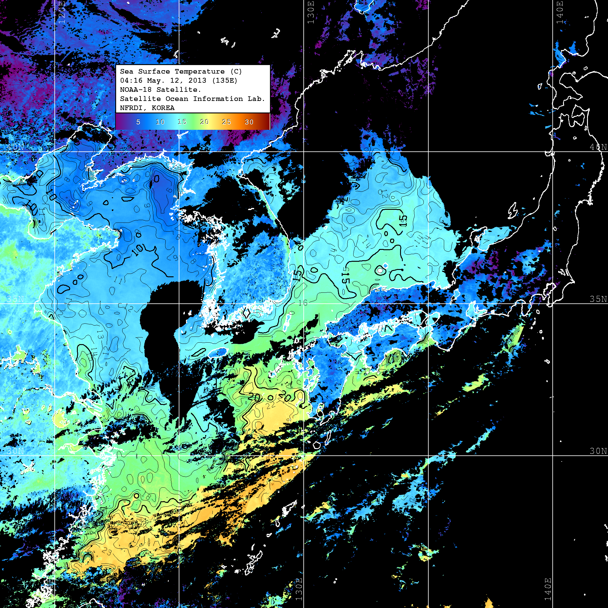 o 2013년 05월 12일 NOAA 위성영상입니다. o 영상 시간 및 수온분포는 범례를 참고하시기 바랍니다. o 검은색은 구름을 나타냅니다. o 그림을 클릭하시면 크게 보실 수 있습니다.