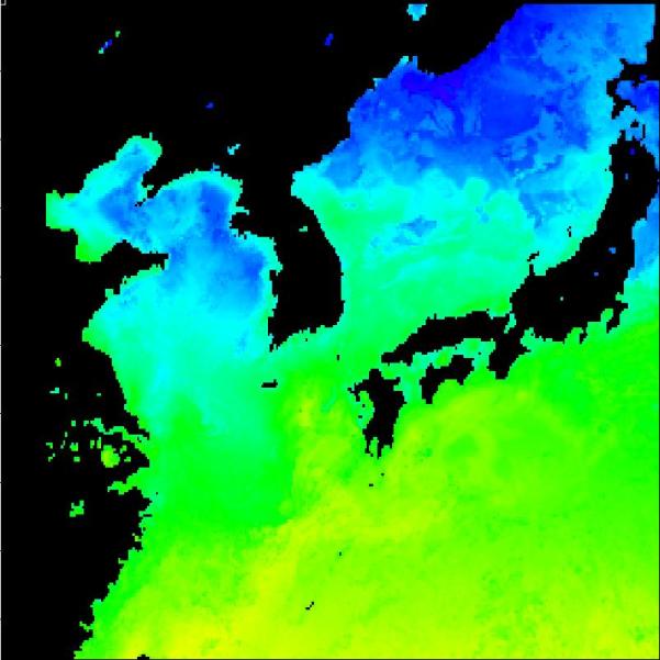 국립수산과학원 위성해양정보실에서 연구중인 2013년 05월 13일 구름이 배제된 수온 영상입니다