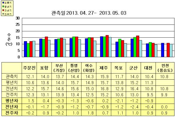 ◦ 금주(2013. 05. 04~2013. 05. 10)의 한반도 연안 표면수온은 동해 연안역에서 섭씨 12.5~14.5도, 남해 연안역 15.5~16.5도, 서해 연안역에서 11.5~17.0도로 나타납니다. ◦ 평년에 비해 주문진 1.6도 높음을 제외한 동해 연안역은 비슷하게, 통영(산양) 0.7도 낮음을 제외한 남해 연안역은 비슷하게, 군산 비슷함을 제외한 서해 연안역은 0.5~2.5도 낮게 나타납니다. ◦ 전년에 비해 주문진 비슷함을 제외한 동해 연안역은 1.0~3.5도 낮게, 남해 연안역은 0.5~2.5도 낮게, 서해 연안역은 0.5~1.5도 낮게 나타납니다. |