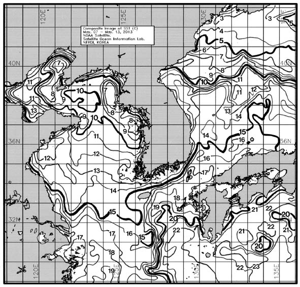 ◦ 금주(2013. 05. 14~2013. 05. 20)의 한국근해 표면수온은 대화퇴 근해 8~9도, 울릉도-독도 근해 12~13도, 대마도 근해 17~18도, 제주도 근해 16~17도, 이어도 근해 16~17도, 가거초 근해 13~14도, 어청도 근해 9~10도, 백령도 근해 8∼9도로 나타납니다. ◦「평년에 비해」대화퇴 근해 3.8도 낮게, 울릉도-독도 근해 2.5도 낮게, 대마도 근해 0.7도 높게, 제주도 근해 비슷하게, 이어도 근해 0.8도 높게, 가거초 근해 1.1도 높게, 어청도 근해 2.1도 낮게 나타납니다. ◦「전년에 비해」대화퇴 근해 4.5도 낮게, 울릉도-독도 근해 4.5도 낮게, 대마도 근해 0.5도 낮게, 제주도 근해 1.5도 낮게, 이어도 근해 비슷하게, 가거초 근해 0.5도 높게, 어청도 근해 2.5도 낮게, 백령도 근해 비슷하게 나타납니다. ◦ 수온 전선대는 우리나라 제주해협에서 대한해협까지 16도를 중심으로 형성됩니다. |