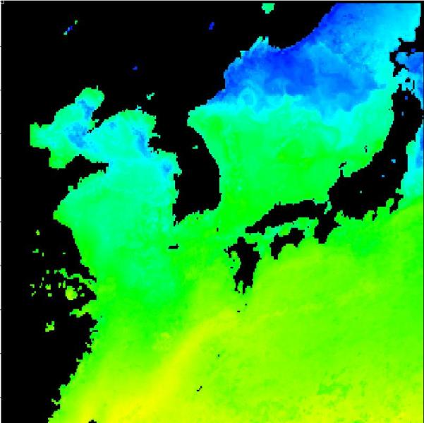 국립수산과학원 위성해양정보실에서 연구중인 2013년 05월 23일 구름이 배제된 수온 영상입니다.