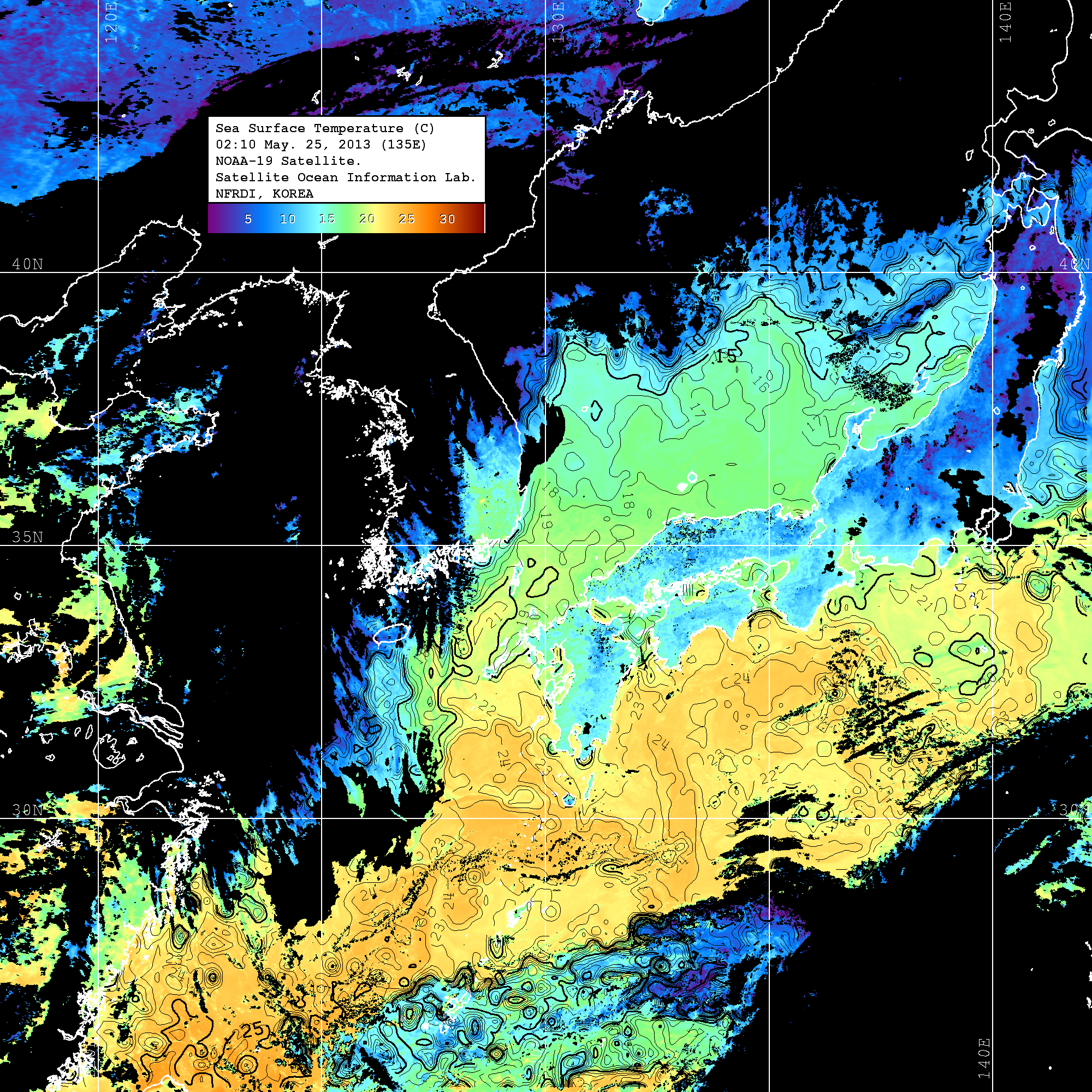 o 2013년 05월 25일 NOAA 위성영상입니다. o 영상 시간 및 수온분포는 범례를 참고하시기 바랍니다. o 검은색은 구름을 나타냅니다. o 그림을 클릭하시면 크게 보실 수 있습니다.