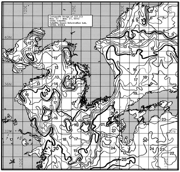 ◦ 금주(2013. 05. 21~2013. 05. 27)의 한국근해 표면수온은 대화퇴 근해 13~14도, 울릉도-독도 근해 15~16도, 대마도 근해 19~20도, 제주도 근해 16~17도, 이어도 근해 16~17도, 가거초 근해 13~14도, 어청도 근해 12~13도, 백령도 근해 8∼10도로 나타납니다. ◦「평년에 비해」대화퇴 근해 0.8도 높게, 울릉도-독도 근해 비슷하게, 대마도 근해 1.7도 높게, 제주도 근해 1.1도 낮게, 이어도 근해 비슷하게, 가거초 근해 1.2도 낮게, 어청도 근해 1.5도 낮게 나타납니다. ◦「전년에 비해」대화퇴 근해 0.5도 높게, 울릉도-독도 근해 2도 낮게, 대마도 근해 비슷하게, 제주도 근해 2도 낮게, 이어도 근해 1.5도 낮게, 가거초 근해 2.5도 낮게, 어청도 근해 2도 낮게, 백령도 근해 2.5도 낮게 나타납니다. ◦ 수온 전선대는 우리나라 제주해협에서 대한해협까지 17도를 중심으로 형성됩니다. |