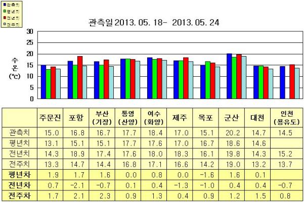 ◦ 금주(2013. 05. 18~2013. 05. 24)의 한반도 연안 표면수온은 동해 연안역에서 섭씨 15~17도, 남해 연안역 17.0~18.5도, 서해 연안역에서 14.5~20.5도로 나타납니다. ◦ 평년에 비해 동해 연안역은 1.5~2.0도 높게, 여수(화양) 0.8도 높음을 제외한 남해 연안역은 비슷하게, 서해 연안역은 목포 1.6도 낮게, 군산 1.6도 높게, 대천 비슷하게 나타납니다. ◦ 전년에 비해 주문진 0.7도 높음을 제외한 동해 연안역은 0.5~2.5도 낮게, 제주 1.3도 낮음을 제외한 남해 연안역은 비슷하게, 군산, 대천 0.4도 높음을 제외한 서해 연안역은 0.5~1.0도 낮게 나타납니다. |