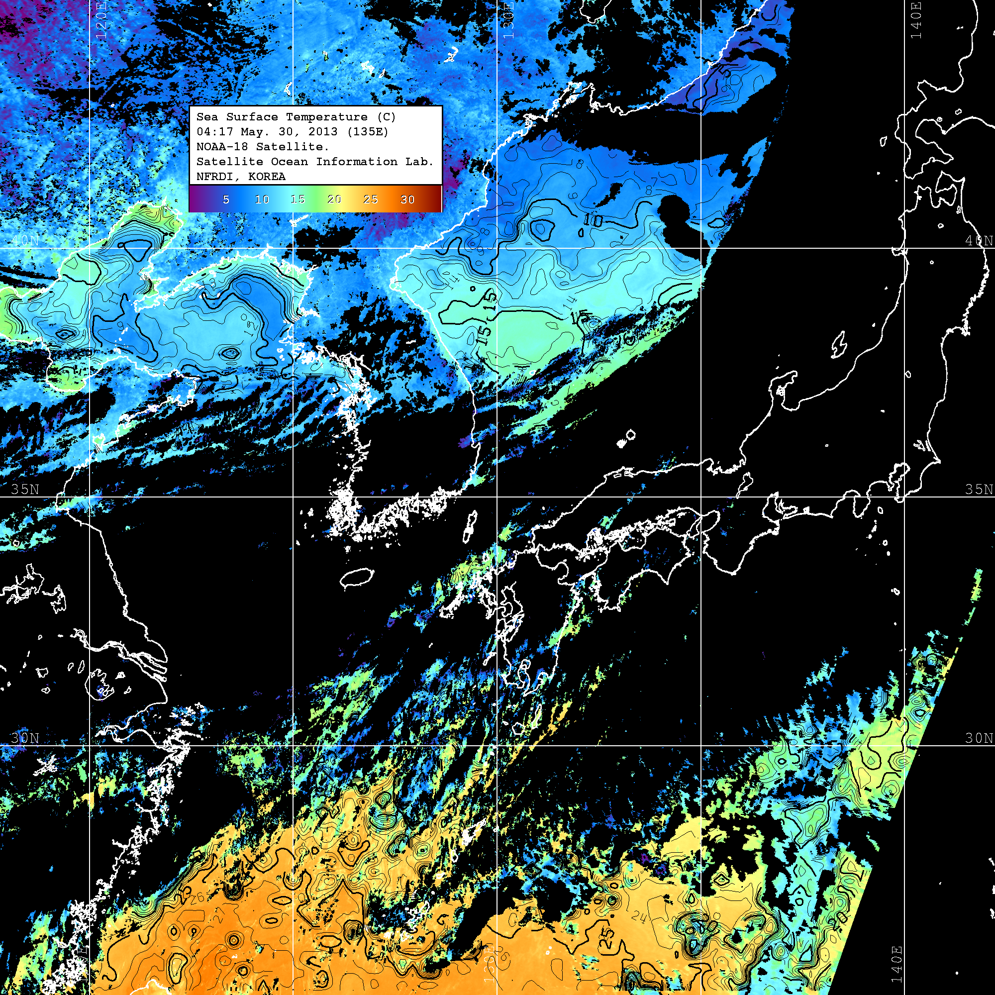 o 2013년 05월 30일 NOAA 위성영상입니다. o 영상 시간 및 수온분포는 범례를 참고하시기 바랍니다. o 검은색은 구름을 나타냅니다. o 그림을 클릭하시면 크게 보실 수 있습니다.