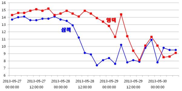 ◦ 국립수산과학원의 실시간 관측을 통한 동해 중부해역 (삼척, 영덕)의 표층 수온자료 분석 결과임. (5월 27일, 0시∼5월 30일, 9시) ◦ 5월 30일 9시 현재, 수온은 삼척과 영덕 연안역에서 8∼9℃ 내외로 나타나고 있음. ◦ 이는 지난 5월 27일 수온 대비 약 5℃ 급하강한 수온임.