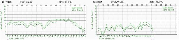 ◦ 저수온 발생 원인은 5월 27일 이후 지속적으로 남풍계열의 바람이 5∼10m/s 내외로 불어, 바람 기인의 연안용승에 의한 냉수의 표층 출현으로 판단됨. (기상청의 동해 해상부이의 풍속 자료)