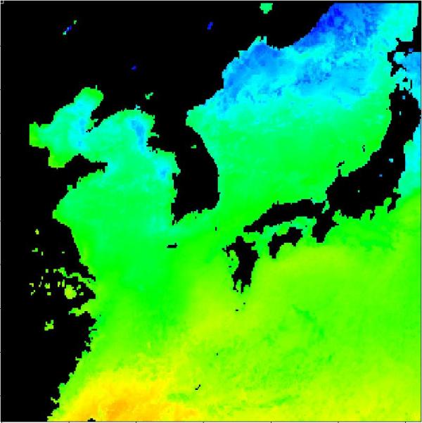 국립수산과학원 위성해양정보실에서 연구중인 2013년 06월 01일 구름이 배제된 수온 영상입니다.