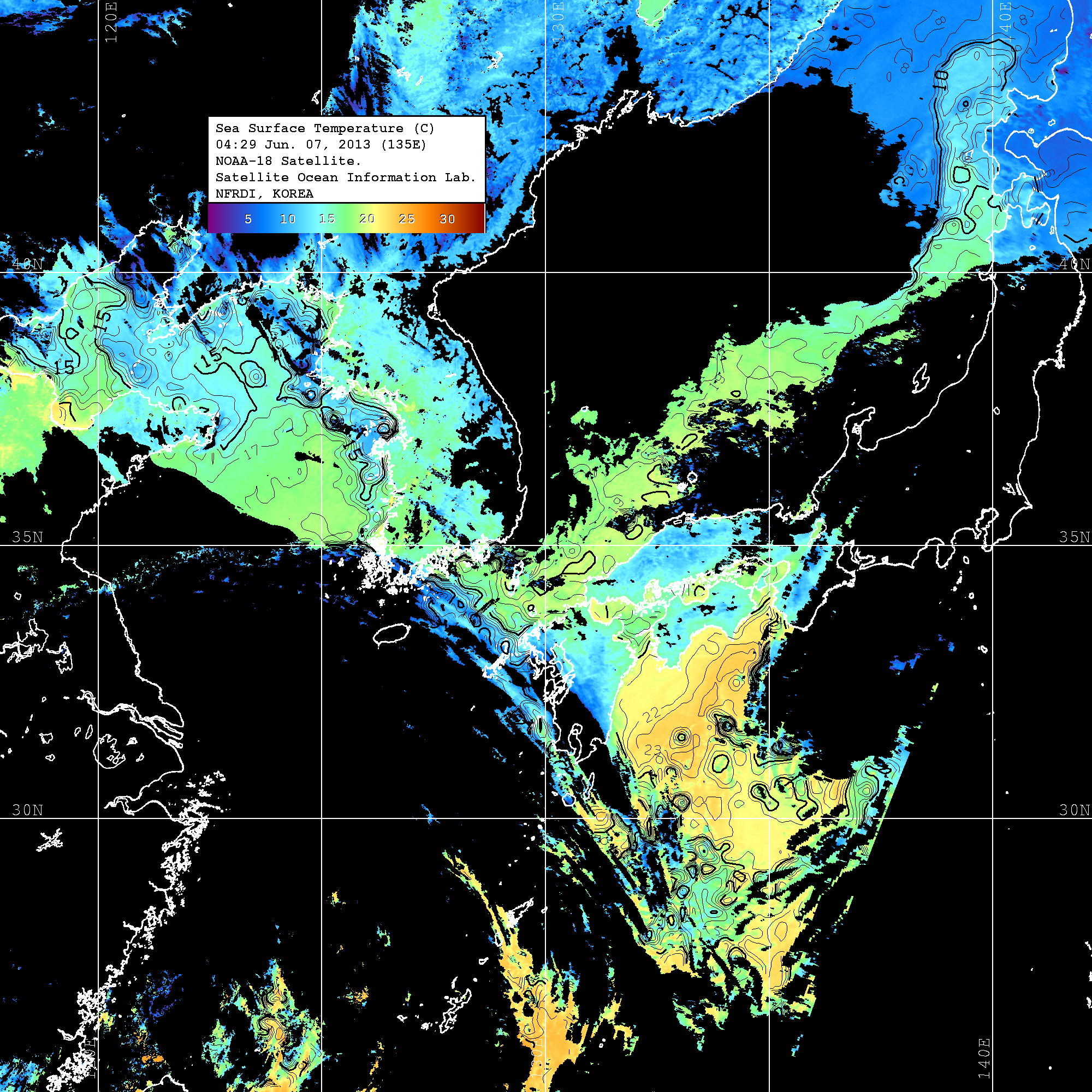 o 2013년 06월 07일 NOAA 위성영상입니다. o 영상 시간 및 수온분포는 범례를 참고하시기 바랍니다. o 검은색은 구름을 나타냅니다. o 그림을 클릭하시면 크게 보실 수 있습니다.
