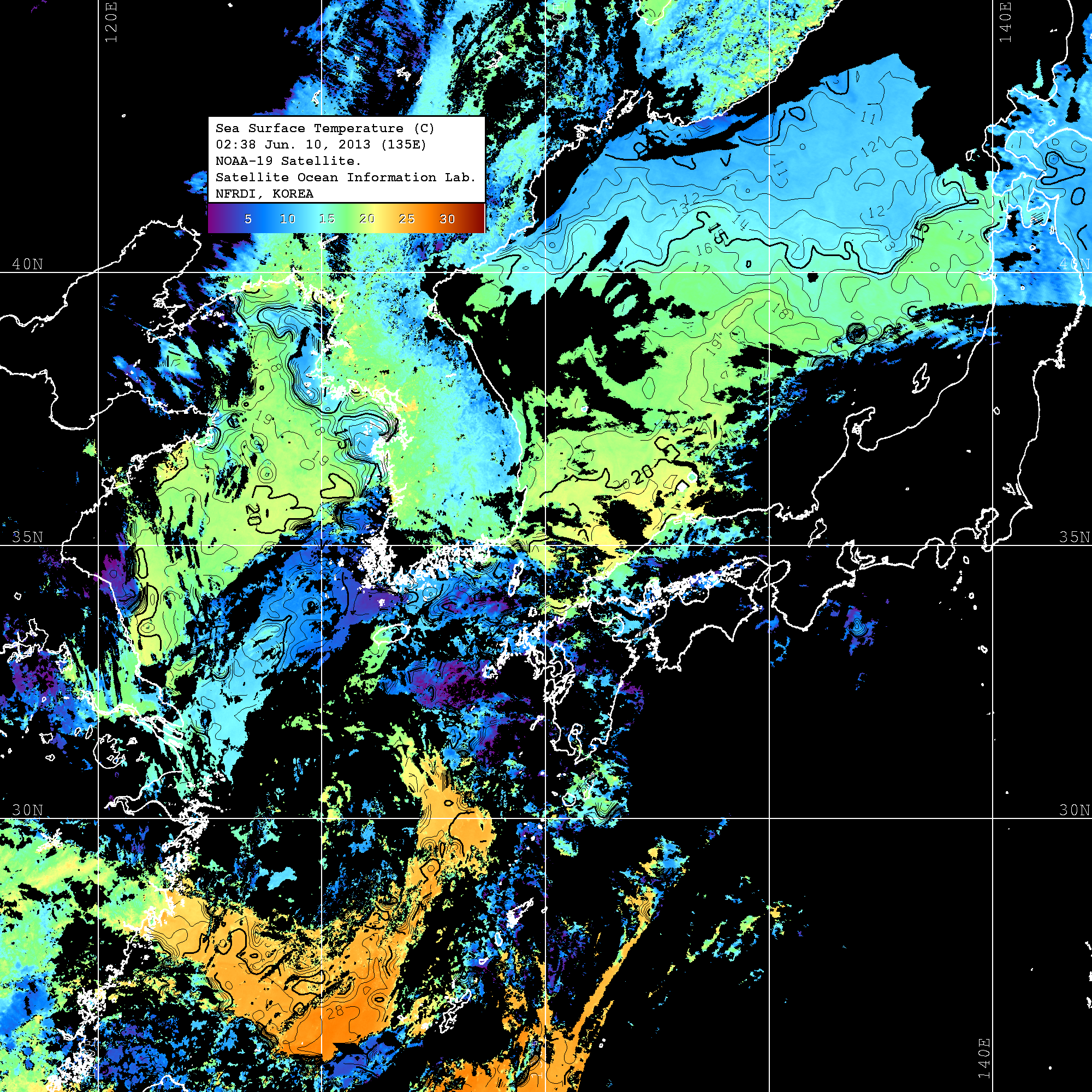 o 2013년 06월 10일 NOAA 위성영상입니다. o 영상 시간 및 수온분포는 범례를 참고하시기 바랍니다. o 검은색은 구름을 나타냅니다. o 그림을 클릭하시면 크게 보실 수 있습니다.