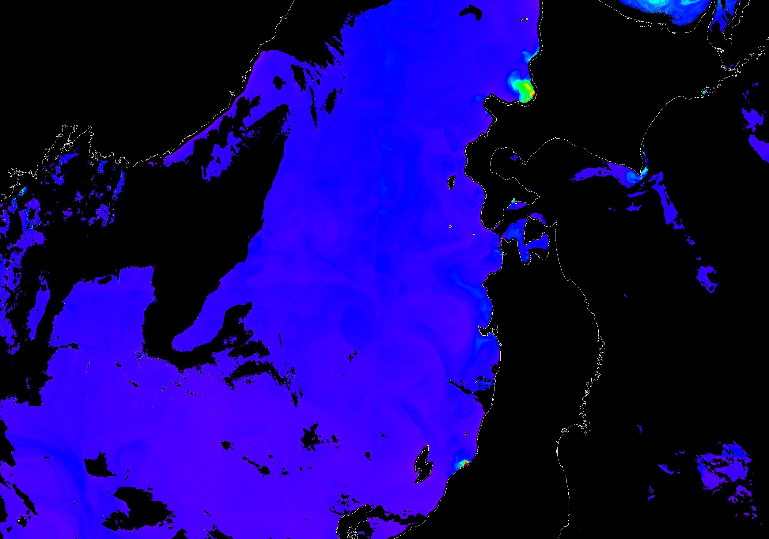 o 2013년 06월 11일 천리안 GOCI 위성영상입니다. [ GOCI : Geostationary Ocean Color Imager ] o 농도분포는 하단 범례를 참고하시기 바랍니다. o 검은색은 구름을 나타냅니다. o 그림을 클릭하시면 크게 보실 수 있습니다. o 천리안 GOCI 클로로필 a 동해지역. o 천리안 GOCI 클로로필 a 서해지역. o 천리안 GOCI 클로로필 a 남해지역. 천리안 GOCI 클로로필 a 둥중국해지역. o 천리안 GOCI 클로로필 a 대화퇴지역. ![]() 천리안 GOCI 영상은 한국해양과학기술원 해양위성센터에서 수신하였습니다. |