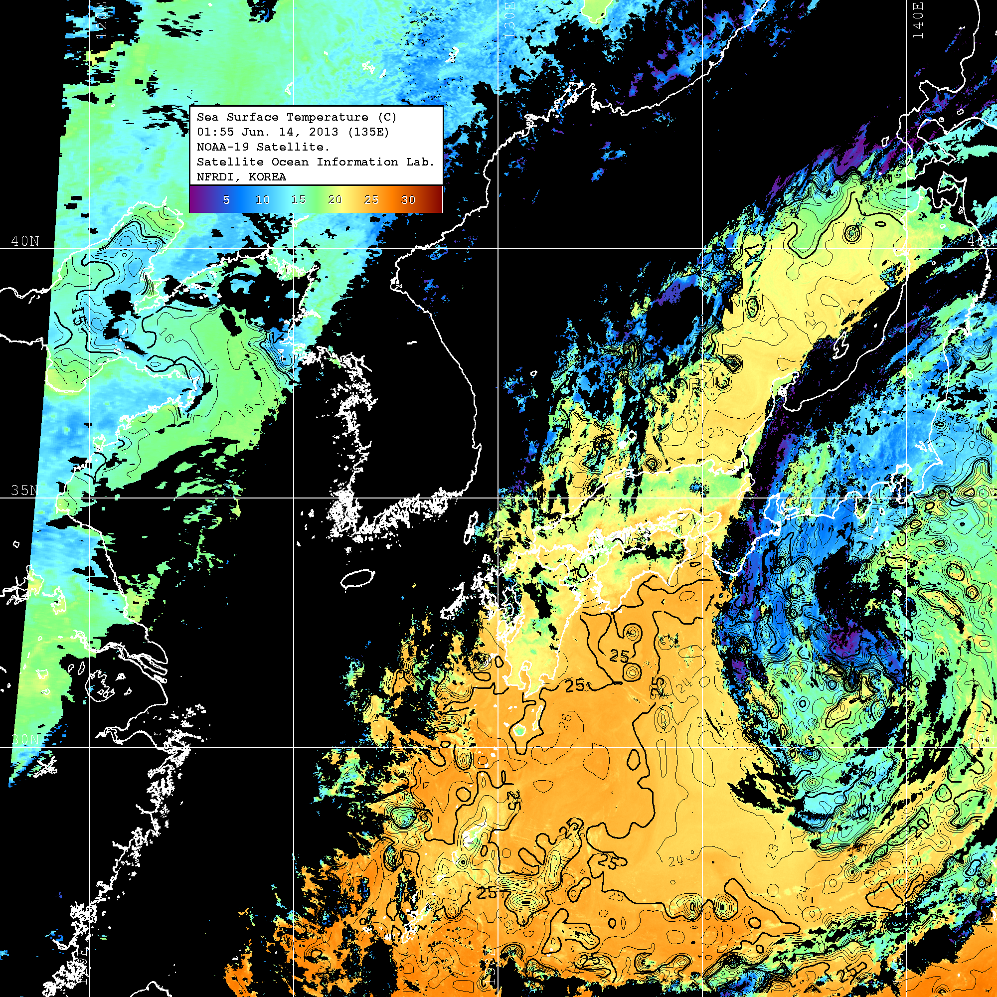 o 2013년 06월 14일 NOAA 위성영상입니다. o 영상 시간 및 수온분포는 범례를 참고하시기 바랍니다. o 검은색은 구름을 나타냅니다. o 그림을 클릭하시면 크게 보실 수 있습니다.