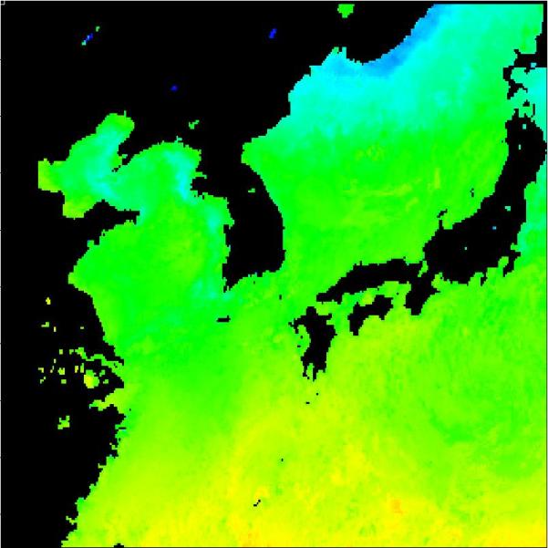 국립수산과학원 위성해양정보실에서 연구중인 2013년 06월 15일 구름이 배제된 수온 영상입니다.