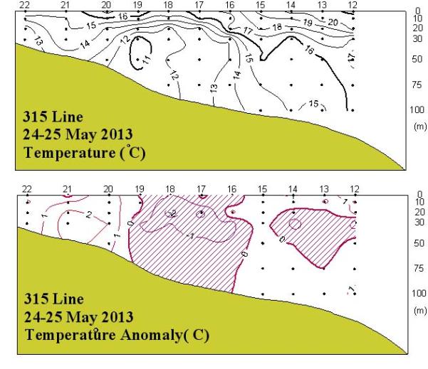 ◦ 2013년 5월 24∼25일 국립수산과학원 남서해수산연구소에서 조사한 동중국해 북부해역(315선)의 수온 수직분포도와 평년편차도입니다.