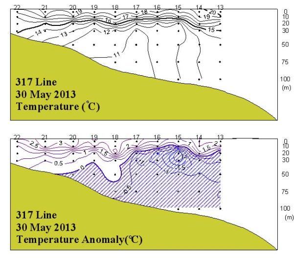 ◦ 2013년 5월 30일 국립수산과학원 남서해수산연구소에서 조사한 동중국해 북부해역(317선)의 수온 수직분포도와 평년편차도입니다.