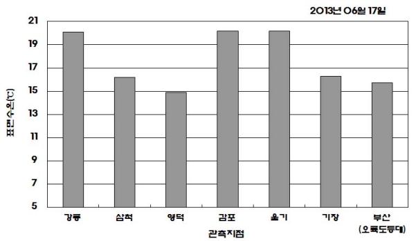◦ 아래 그림은 2013년 06월 17일 오후 3시에 관측된 현장 표면수온 분포입니다. ◦ 연안 관측 표면수온은 강릉 섭씨 20.1도 삼척 16.2도, 영덕 14.9도, 감포 20.2도, 울기 20.2도, 기장 16.3도, 부산(오륙도등대) 15.7도의 수온을 나타내고 있습니다. ◦ 현재 동해연안 중 삼척, 영덕, 기장, 부산(오륙도등대) 연안역의 표면수온이 주변해역에 비해 다소 낮게(3~4℃) 나타나고 있으니 향후에도 수온변화에 각별한 주의를 당부 드립니다. |