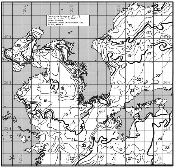 ◦ 금주(2013. 06. 11~2013. 06. 17)의 한국근해 표면수온은 대화퇴 근해 19~20도, 울릉도-독도 근해 20~21도, 대마도 근해 20~21도, 제주도 근해 19~20도, 이어도 근해 19~20도, 가거초 근해 18~19도, 어청도 근해 17~18도, 백령도 근해 14∼15도로 나타납니다. ◦「평년에 비해」대화퇴 근해 1.8도 높게, 울릉도-독도 근해 1.4도 높게, 대마도 근해 비슷하게, 제주도 근해 1도 낮게, 이어도 근해 1.1도 낮게, 가거초 근해 0.8도 낮게, 어청도 근해 0.4도 낮게 나타납니다. ◦「전년에 비해」대화퇴 근해 1도 높게, 울릉도-독도 근해 1.5도 높게, 대마도 근해 0.5도 높게, 제주도 근해 2도 낮게, 이어도 근해 비슷하게, 가거초 근해 2.5도 낮게, 어청도 근해 2도 낮게, 백령도 근해 0.5도 낮게 나타납니다. ◦ 수온 전선대는 우리나라 제주해협에서 대한해협까지 19도를 중심으로 형성됩니다. |