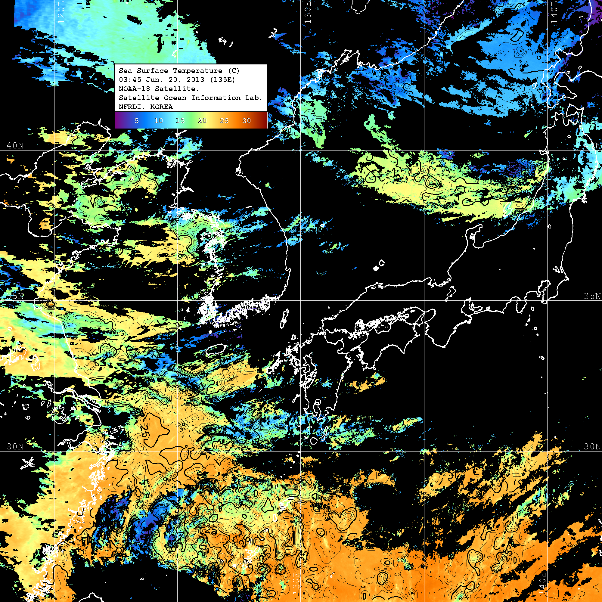 o 2013년 06월 20일 NOAA 위성영상입니다. o 영상 시간 및 수온분포는 범례를 참고하시기 바랍니다. o 검은색은 구름을 나타냅니다. o 그림을 클릭하시면 크게 보실 수 있습니다.