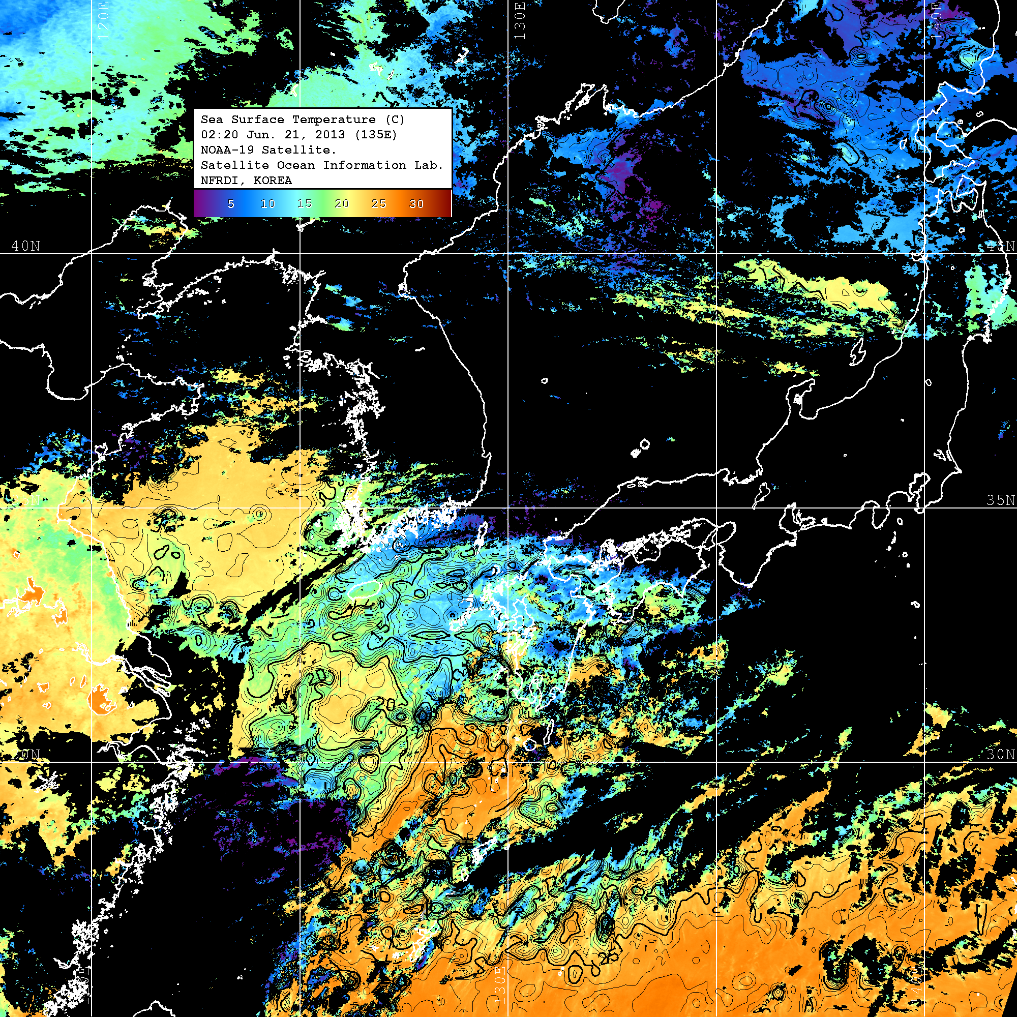 o 2013년 06월 21일 NOAA 위성영상입니다. o 영상 시간 및 수온분포는 범례를 참고하시기 바랍니다. o 검은색은 구름을 나타냅니다. o 그림을 클릭하시면 크게 보실 수 있습니다.