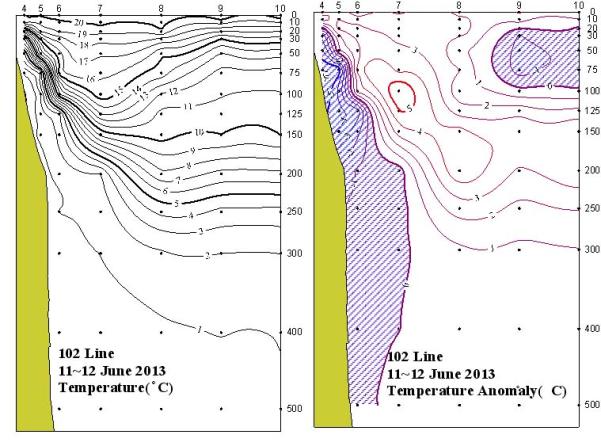 2013년 6월 8~9일 국립수산과학원 동해수산연구소에서 조사한 105선(동해 동방)의 수직수온분포도 및 평년편차도입니다.