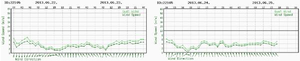 ◦ 6월 25일 현재, 삼척연안 수온은 12∼13℃ 내외로 6월 23일보다 5∼8℃ 수온이 급하강하였음. ◦ 영덕 및 강릉 연안에서도 15∼16℃로 저수온을 나타내고 있음. ◦ 이는 6월 22일 이후 동해 중부해역에서 지속적으로 남풍계열 바람이 불어 발생한 연안 용승에 의한 냉수대로 판단됨
