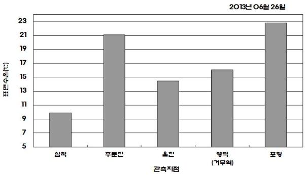 ◦ 아래 그림은 2013년 06월 26일 오후 16시에 관측된 현장 표면수온 분포입니다. ◦ 연안 관측 표면수온은 삼척 섭씨 10.1도, 주문진 21.1도, 울진 14.5도, 영덕(거무역) 16.1도, 포항 22.8도의 수온을 나타내고 있습니다.