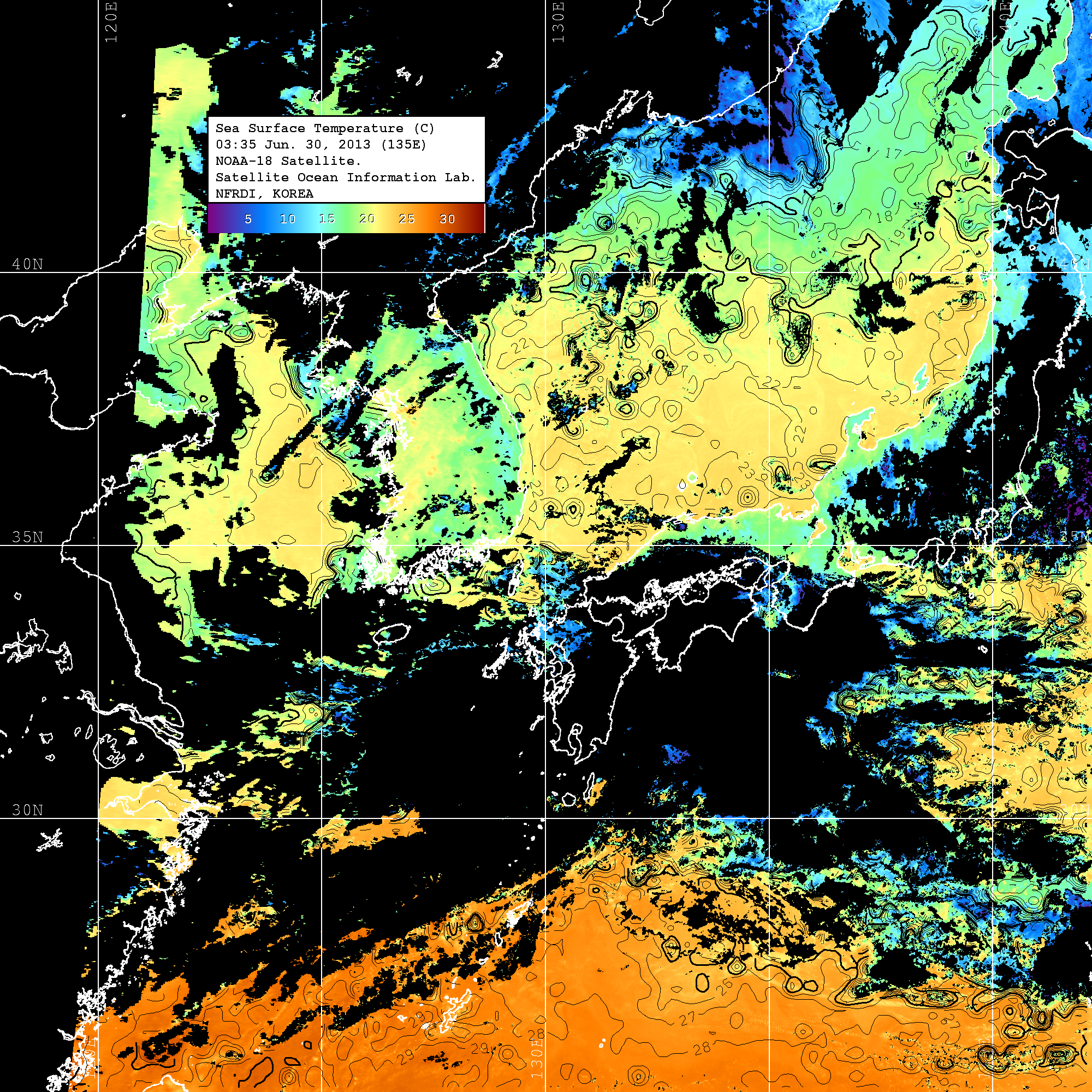 o 2013년 06월 30일 NOAA 위성영상입니다. o 영상 시간 및 수온분포는 범례를 참고하시기 바랍니다. o 검은색은 구름을 나타냅니다. o 그림을 클릭하시면 크게 보실 수 있습니다.