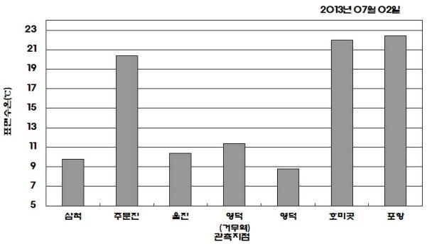 ◦ 아래 그림은 2013년 07월 02일 16시 현재의 표면수온 분포입니다. ◦ 연안 관측 표면수온은 삼척 섭씨 9.8도 주문진 20.4도, 울진 10.4도, 영덕(거무역) 11.4도, 영덕 8.8도, 호미곳 22도, 포항 22.4도의 수온을 나타내고 있습니다. ◦ 한편, 2013년 6월 18일 발령한 삼척, 영덕(거무역)연안 냉수대 주의보(해양자료속보, 제4317호)와 2013년 6월 26일 발령한 울진연안 냉수대 주의보(해양자료속보, 제4324호)는 유효합니다.