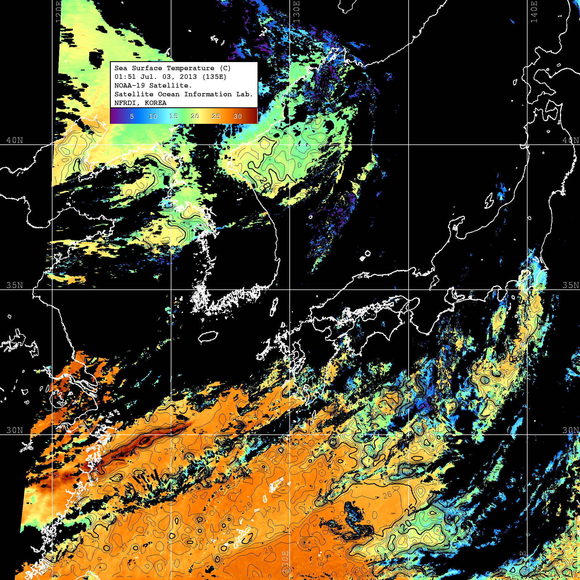o 2013년 07월 03일 NOAA 위성영상입니다. o 영상 시간 및 수온분포는 범례를 참고하시기 바랍니다. o 검은색은 구름을 나타냅니다. o 그림을 클릭하시면 크게 보실 수 있습니다.