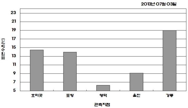 ◦ 아래 그림은 2013년 07월 03일 오전 10시에 관측된 현장 표면수온 분포입니다. ◦ 연안 관측 표면수온은 호미곶 섭씨 14.5℃, 포항 14℃, 영덕 6.3℃, 울진 9.1℃, 강릉 19.0℃의 수온을 나타내고 있습니다.