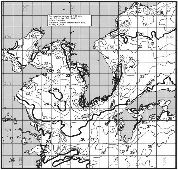 ◦ 금주(2013. 07. 02~2013. 07. 08)의 한국근해 표면수온은 대화퇴 근해 20~22도, 울릉도-독도 근해 23~24도, 대마도 근해 23~24도, 제주도 근해 22~24도, 이어도 근해 24~25도, 가거초 근해 23~24도, 어청도 근해 22~23도, 백령도 근해 19∼20도로 나타납니다. ◦「평년에 비해」대화퇴 근해 0.4도 높게, 울릉도-독도 근해 2.2도 높게, 대마도 근해 0.4도 높게, 제주도 근해 비슷하게, 이어도 근해 비슷하게, 가거초 근해 1도 높게, 어청도 근해 0.6도 높게 나타납니다. ◦「전년에 비해」대화퇴 근해 1도 높게, 울릉도-독도 근해 2도 높게, 대마도 근해 0.5도 높게, 제주도 근해 비슷하게, 이어도 근해 0.5도 높게, 가거초 근해 비슷하게, 어청도 0.5도 높게, 백령도 근해 1.5도 높게 나타납니다. ◦ 수온 전선대는 우리나라 제주해협에서 대한해협까지 22도를 중심으로 형성됩니다. |