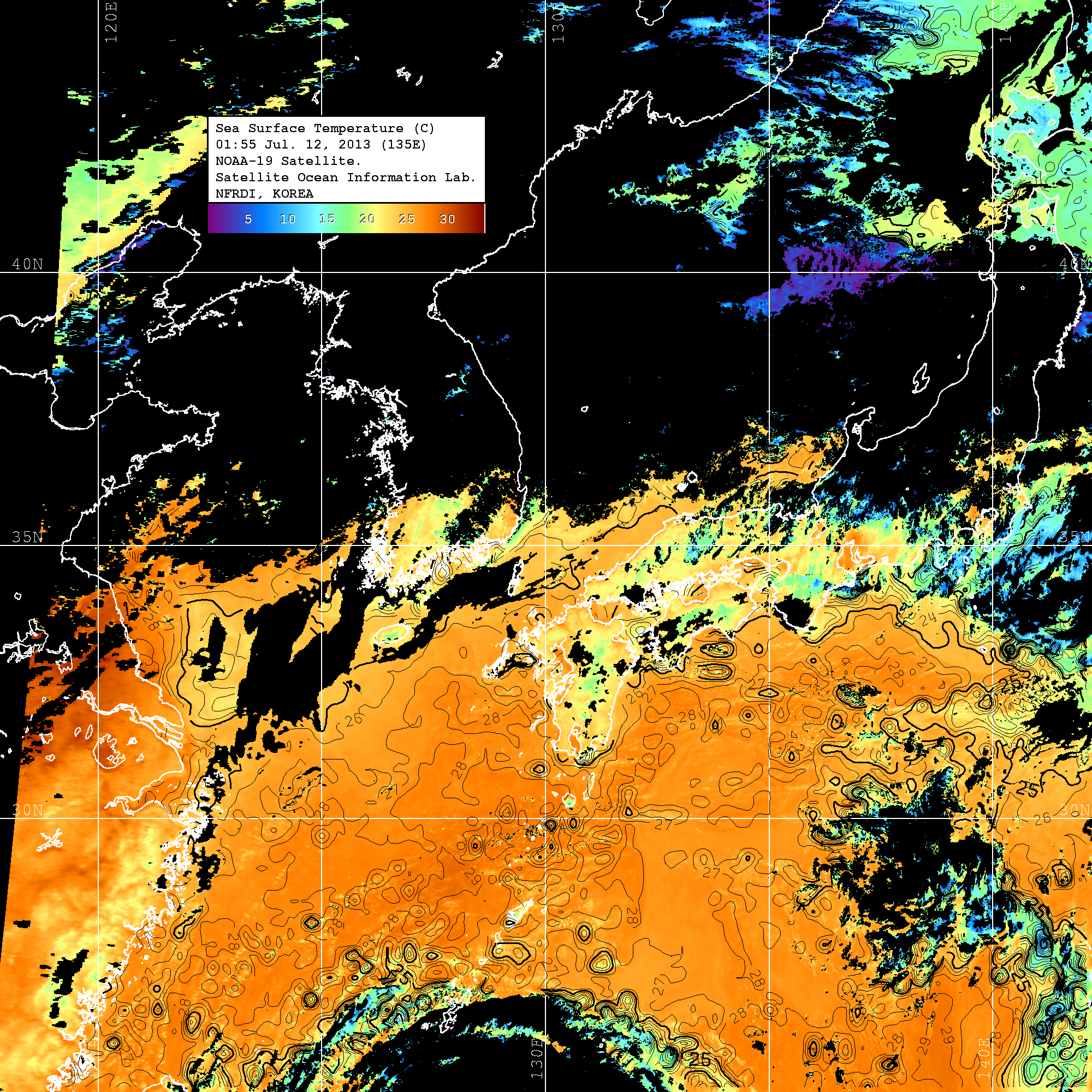 o 2013년 07월 12일 NOAA 위성영상입니다. o 영상 시간 및 수온분포는 범례를 참고하시기 바랍니다. o 검은색은 구름을 나타냅니다. o 그림을 클릭하시면 크게 보실 수 있습니다.