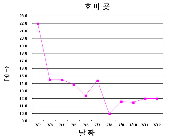 ◦ 2012년 07월 12일 16시를 기해 호미곶연안 냉수대 경보를 발령합니다. ◦ 아래 그림은 2013년 07월 02일부터 7월 12까지의 수온 호미곶 연안의 일별 수온변화 입니다.