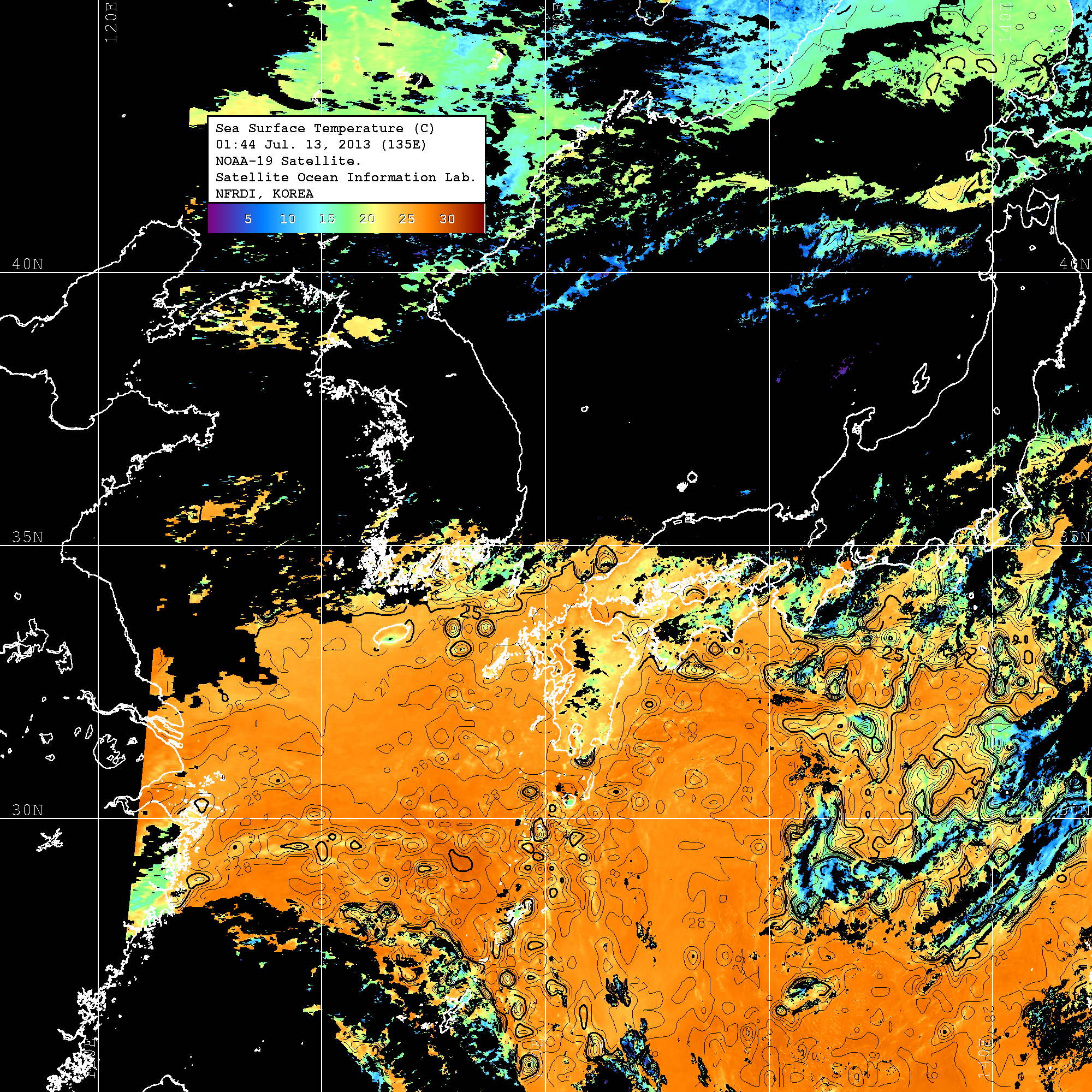 o 2013년 07월 13일 NOAA 위성영상입니다. o 영상 시간 및 수온분포는 범례를 참고하시기 바랍니다. o 검은색은 구름을 나타냅니다. o 그림을 클릭하시면 크게 보실 수 있습니다.